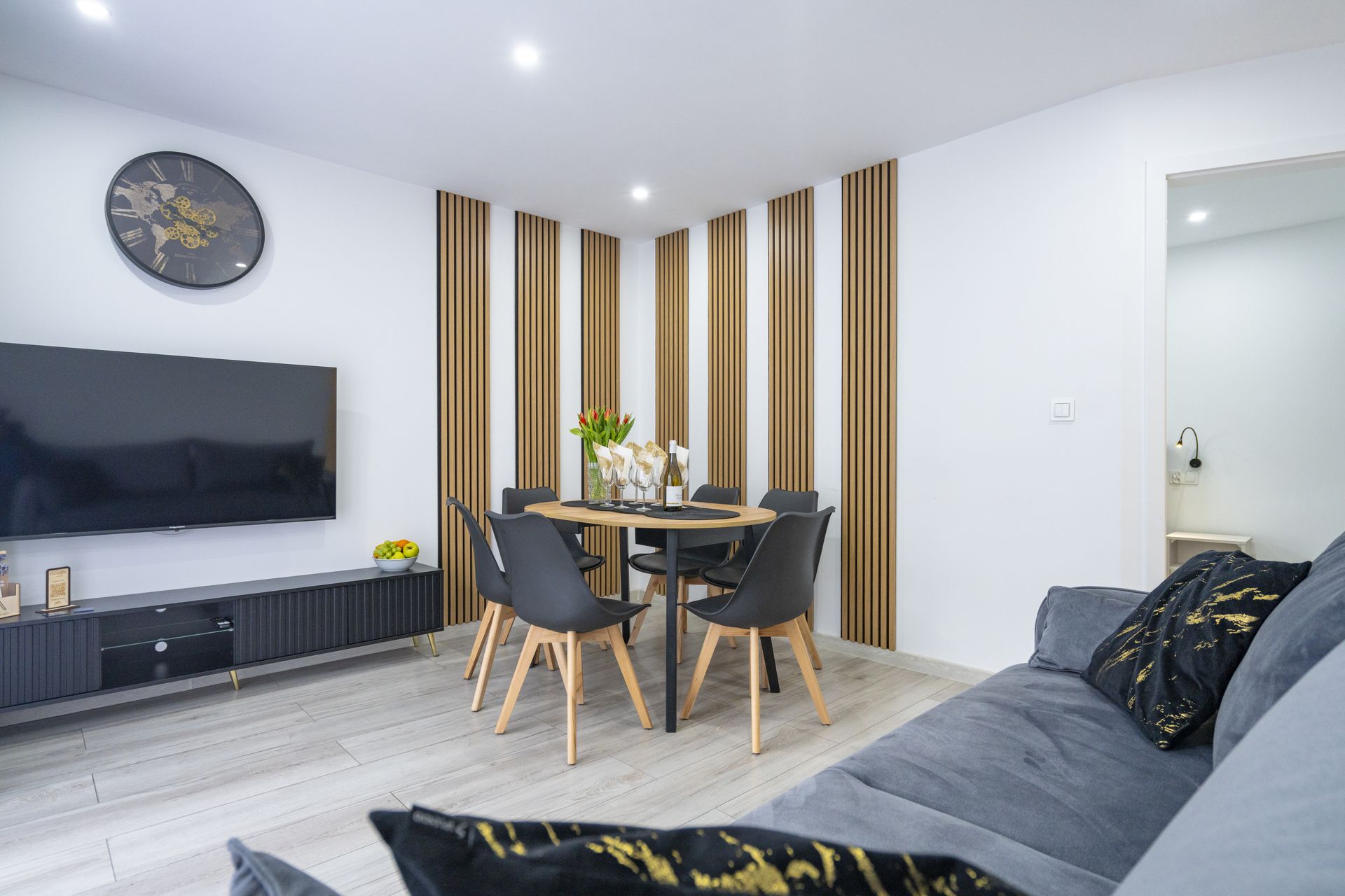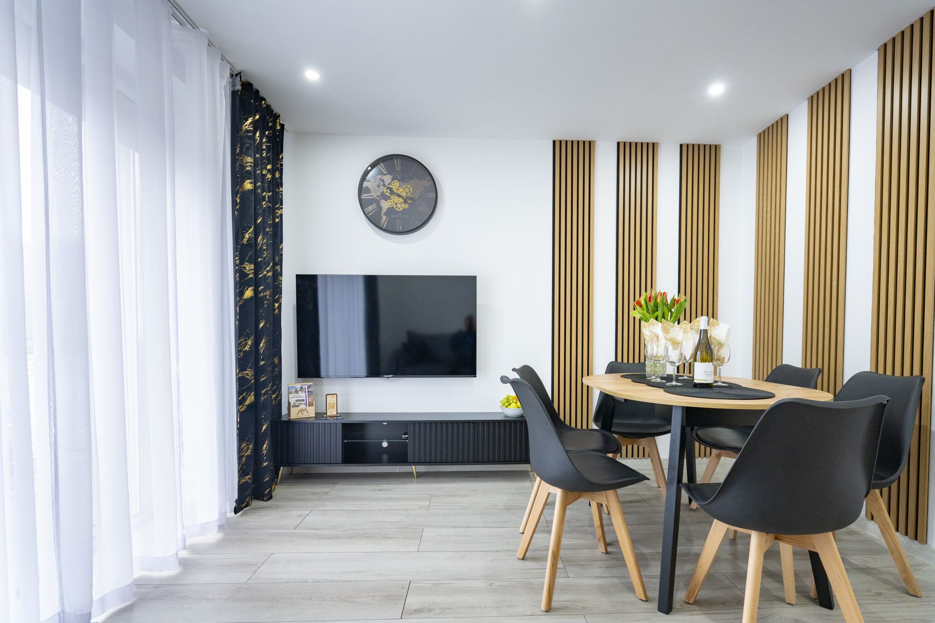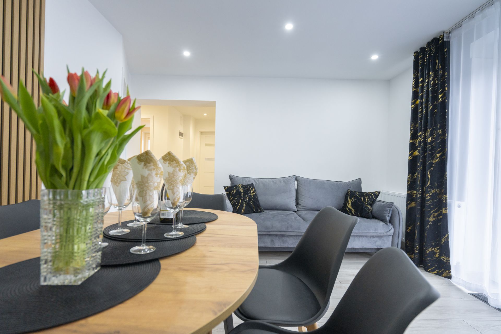 Duzy stół zapewnia komfort wspólnych posiłków oraz balkon z widokiem wraz meblami ogrodowymi daje gwarancje odpoczynku w kontakcie z przyrodą i naturą.